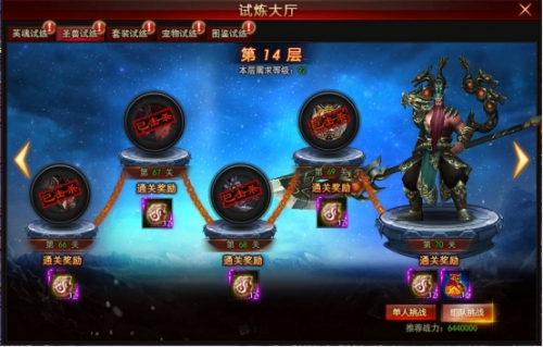 圣獸試煉以通關推層的方式鋪設,每層有5關,每一關通關后都可以獲得相應的通關獎勵。每層的前四關為普通關卡,只能單人挑戰;第5關為boss關,難度很高,可以組隊挑戰。